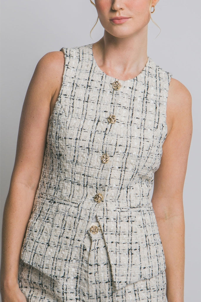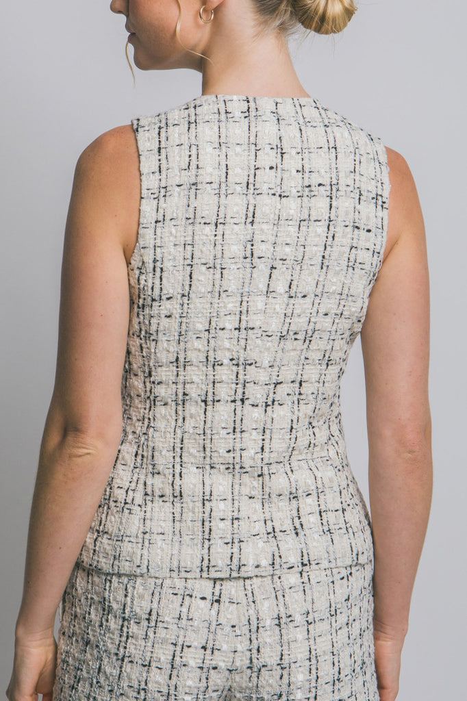 A chic and structured two-piece set featuring a textured tweed fabric.